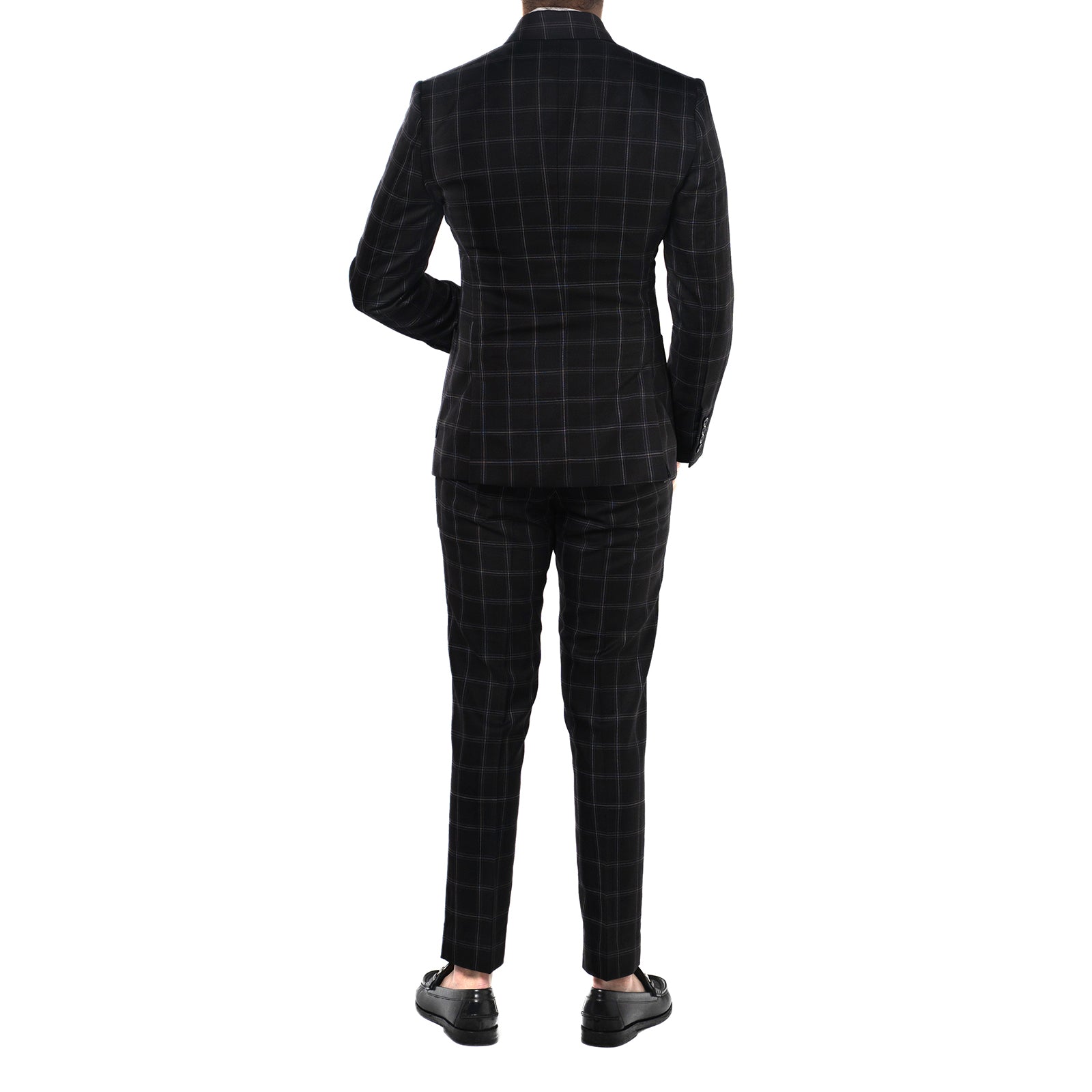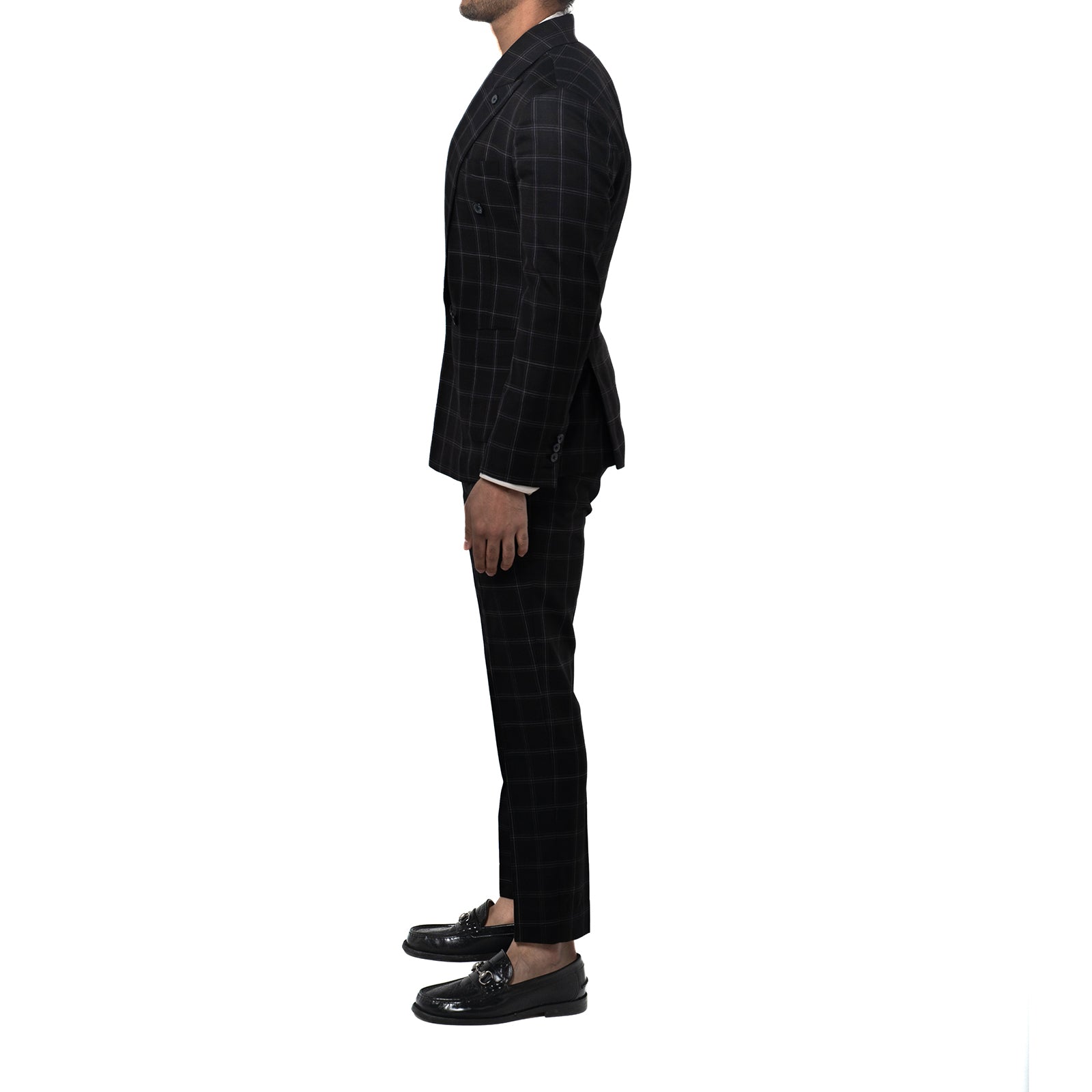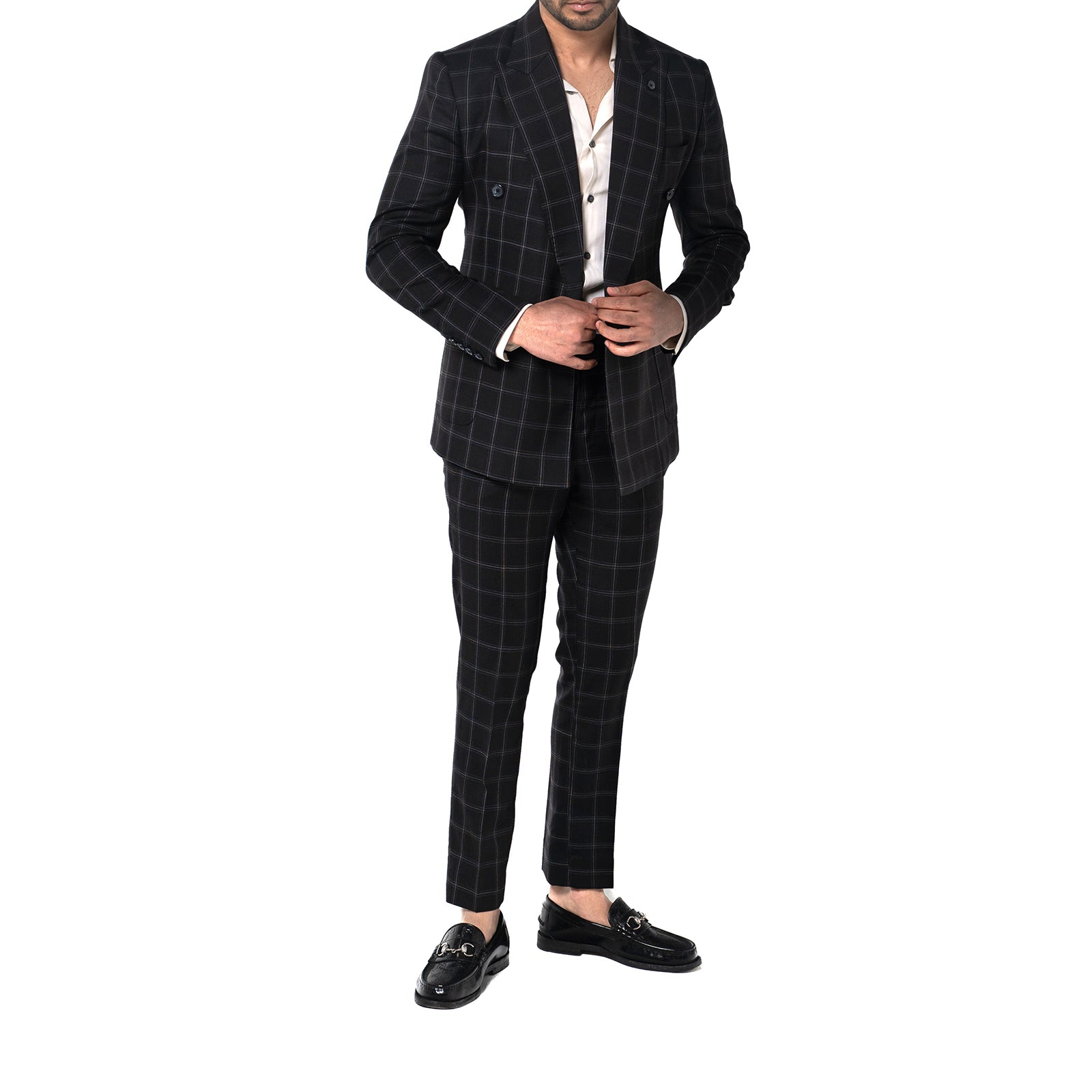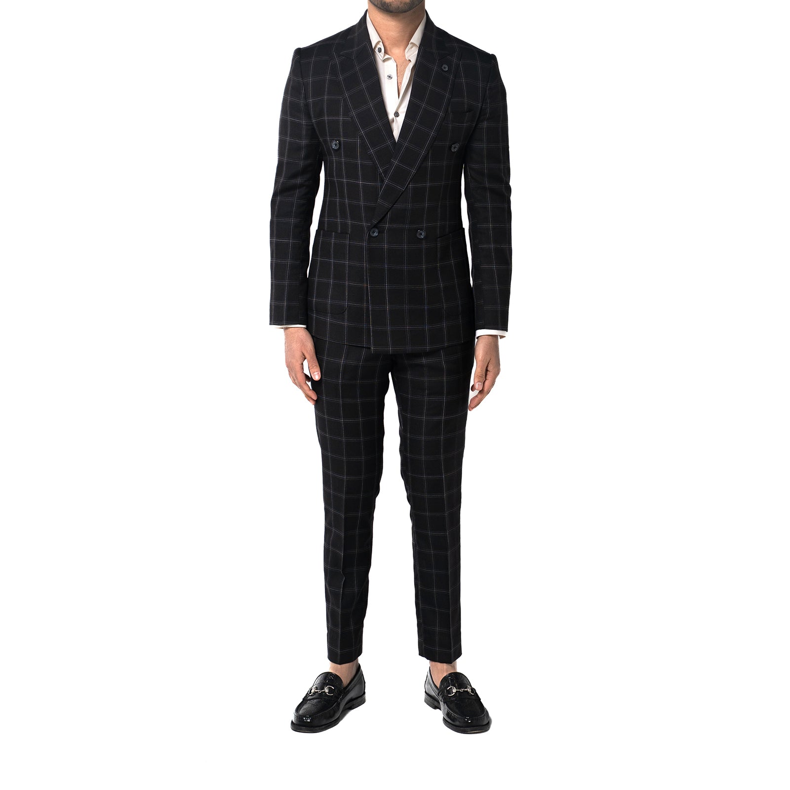 Bold yet refined, the Black Windowpane Double-Breasted Suit is a statement in structured elegance. Tailored for a sharp silhouette, the jacket features a four-button double-breasted closure, wide peak lapels with pique stitching, and padded shoulders that enhance its strong, confident shape. Functional details, like patch pockets and a lapel button, elevate its sartorial edge. The accompanying trousers, designed with a double-button waistband and waist adjusters, complete the look with effortless refinement.