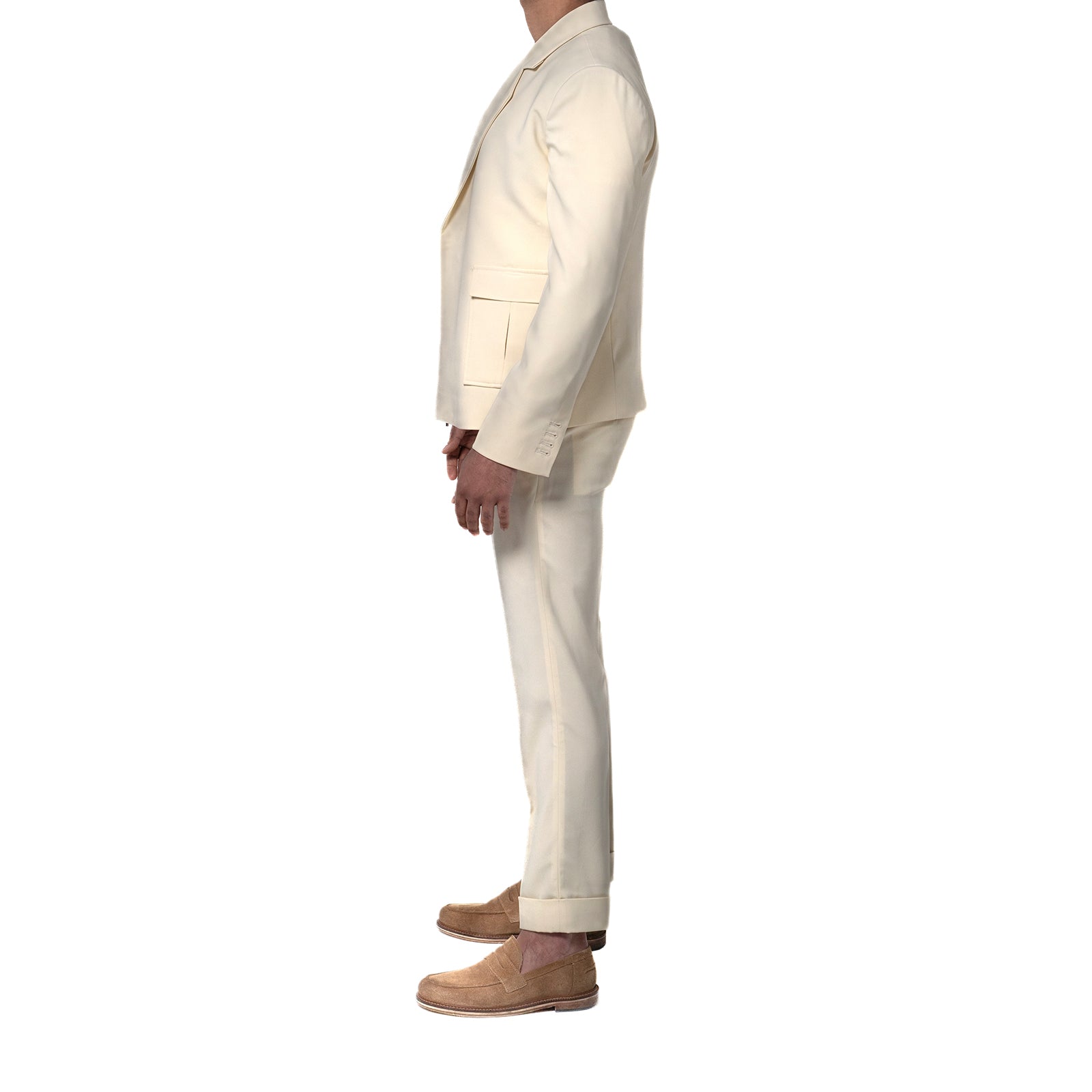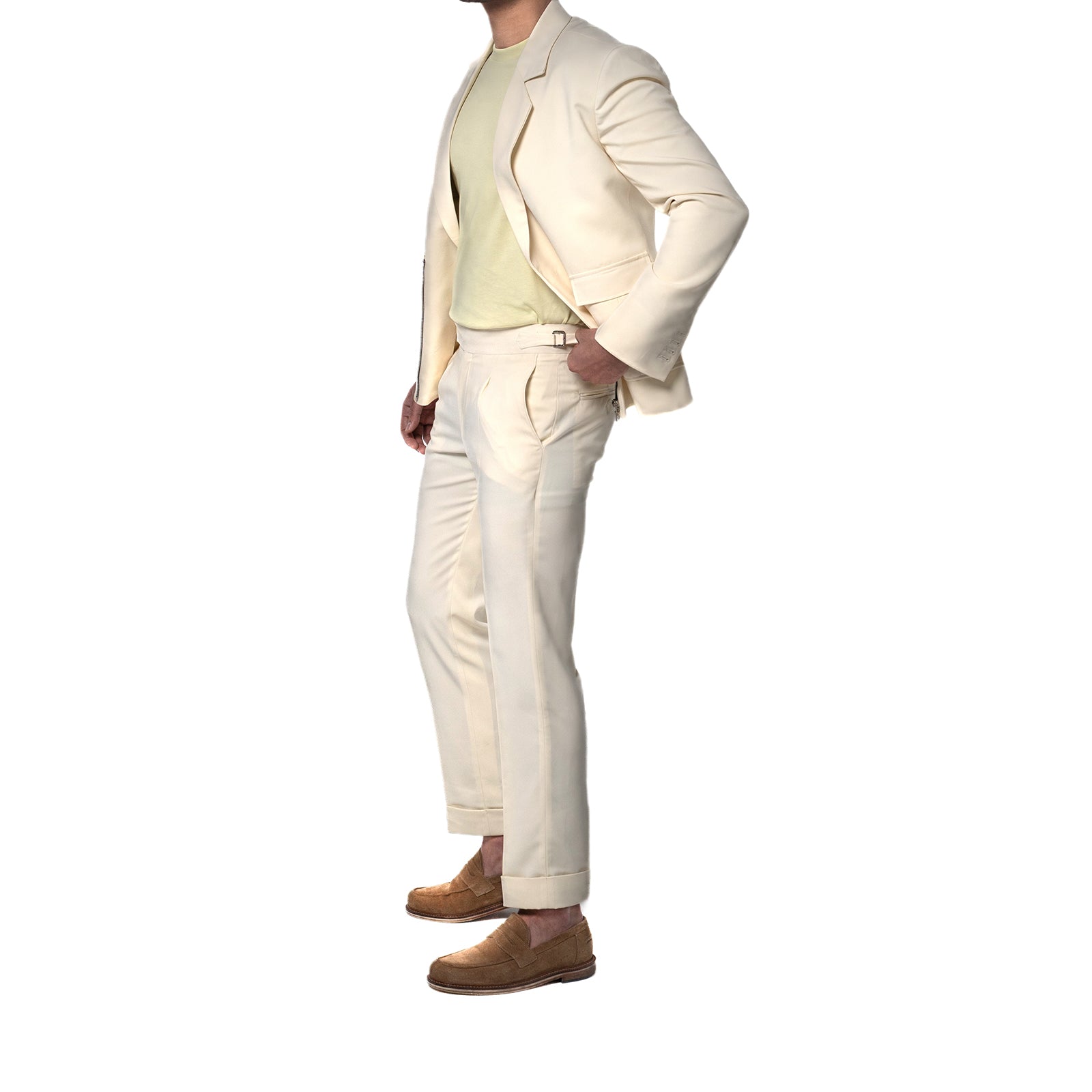 | Fabric: | Off-white suiting cloth with a light, dry hand and fluid structure |
