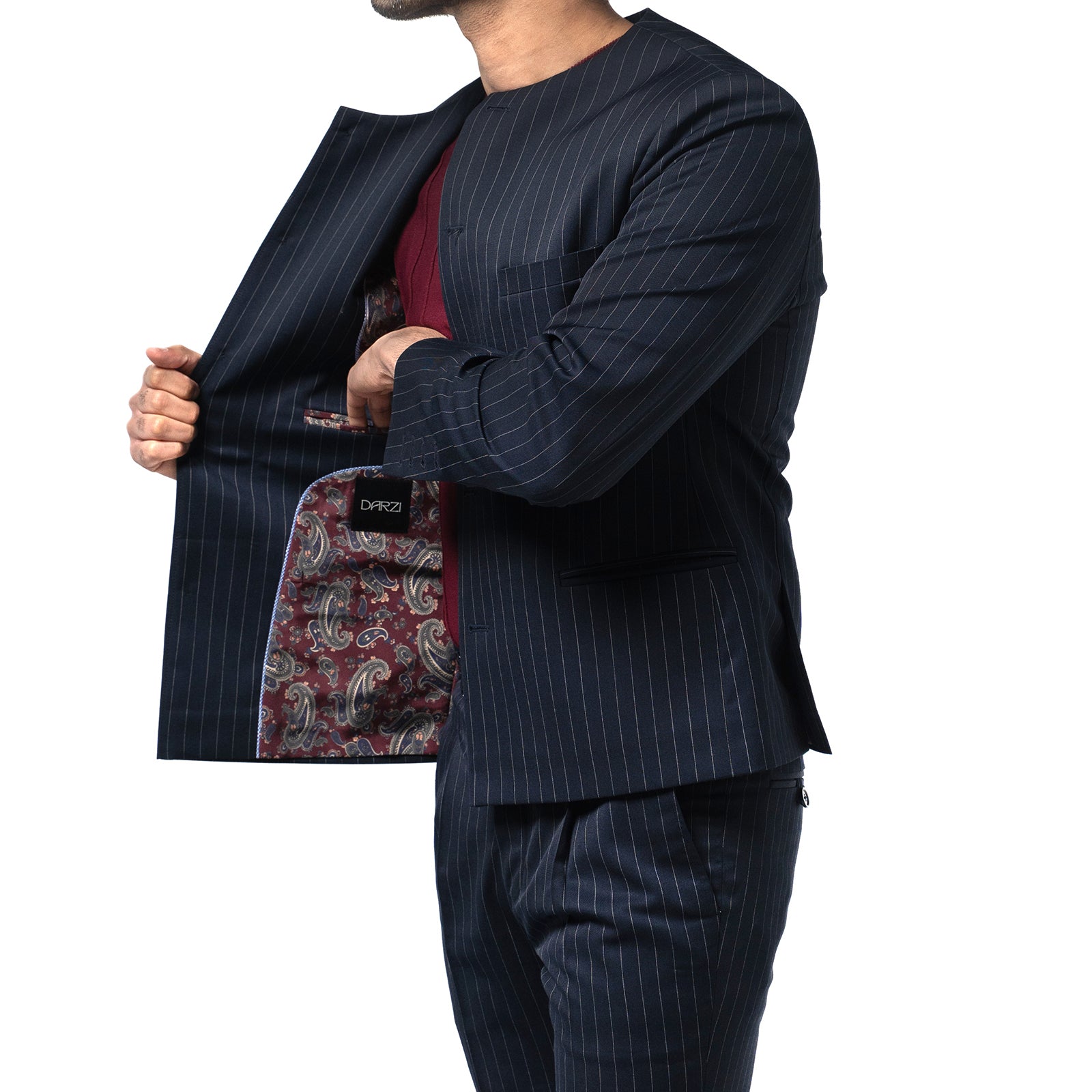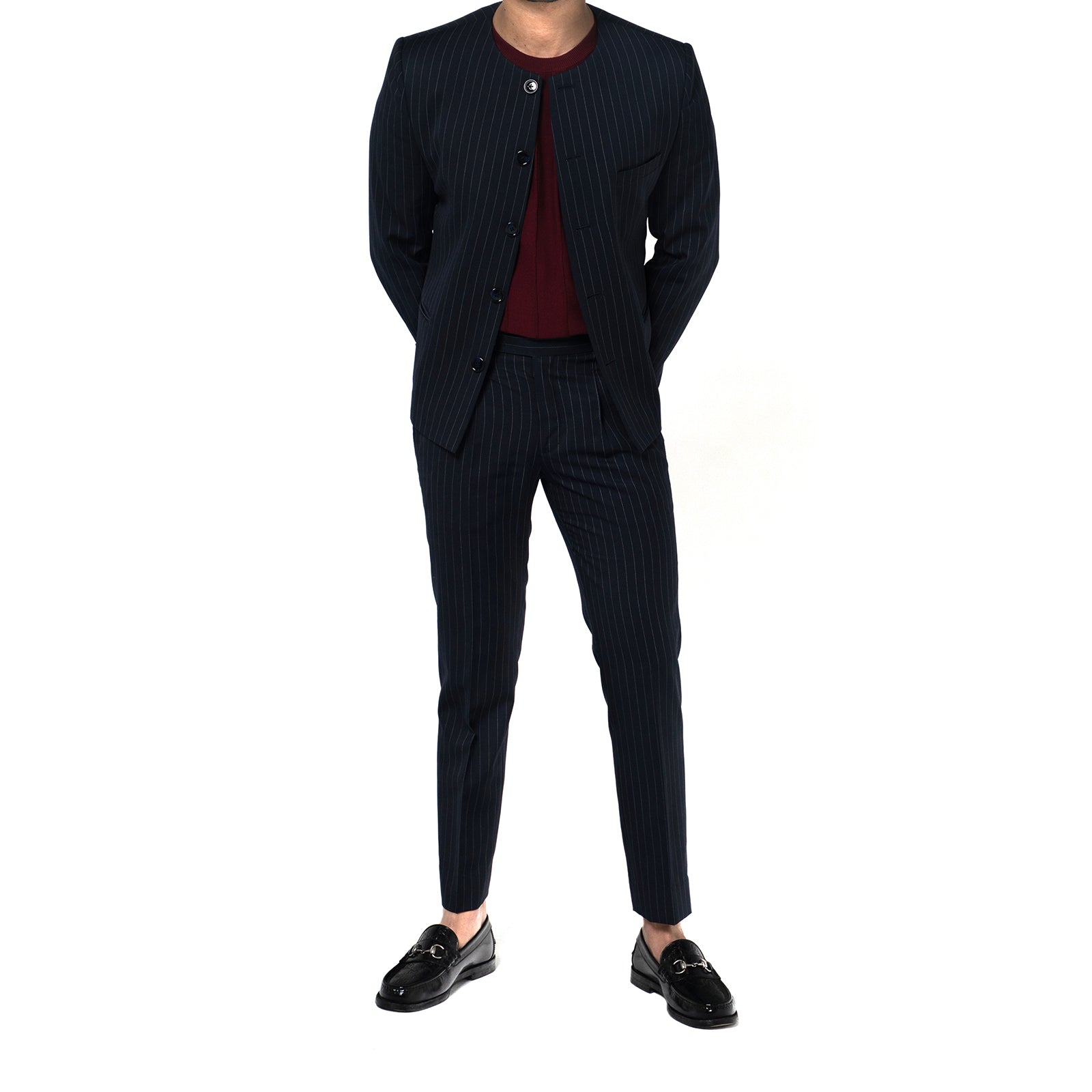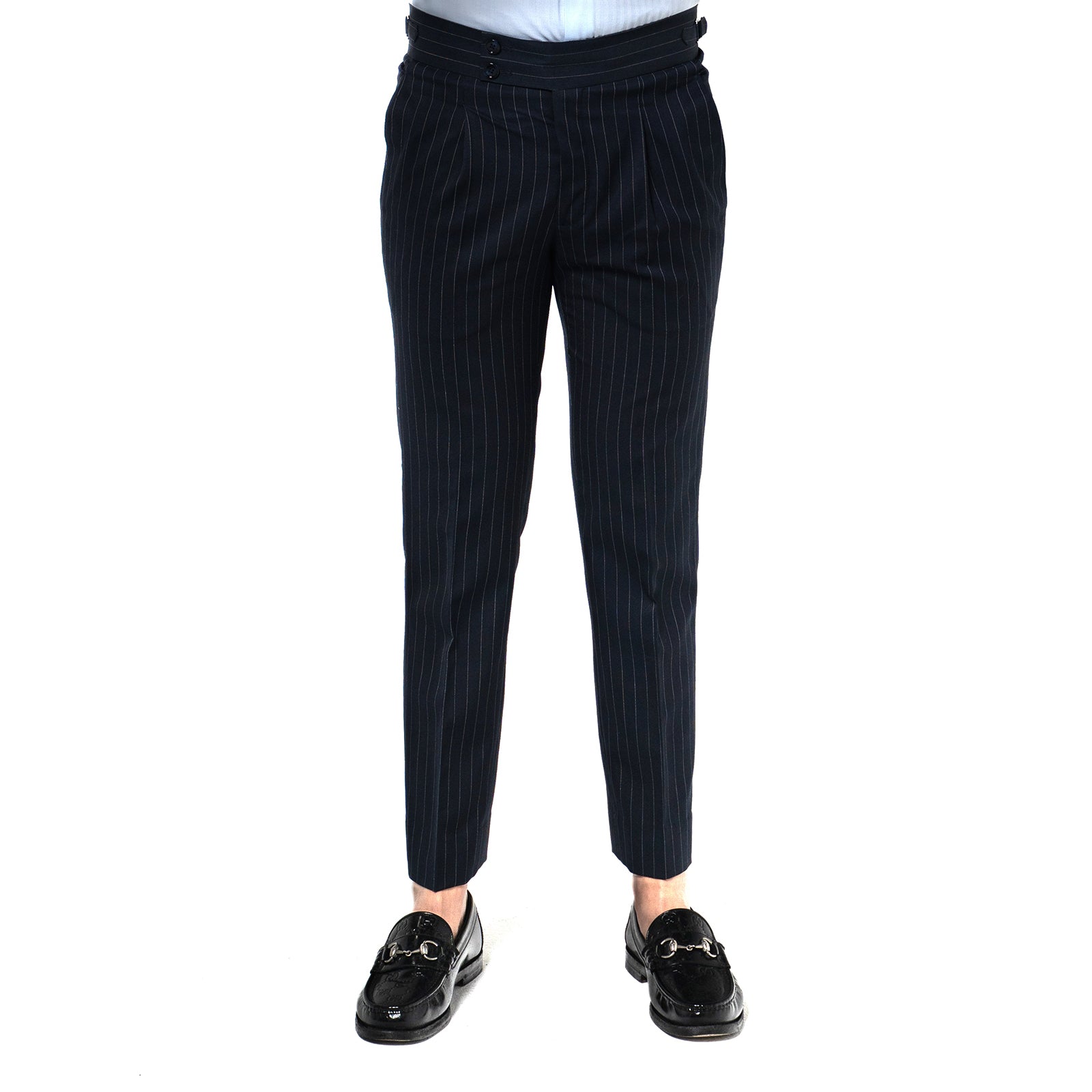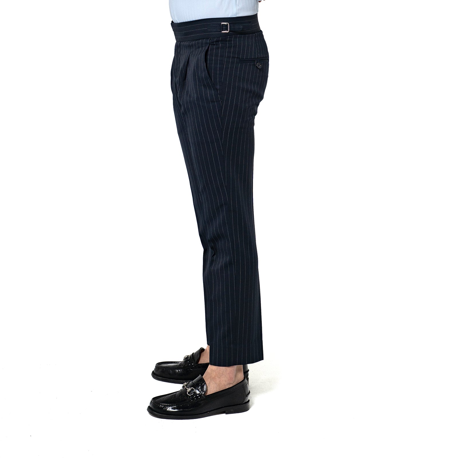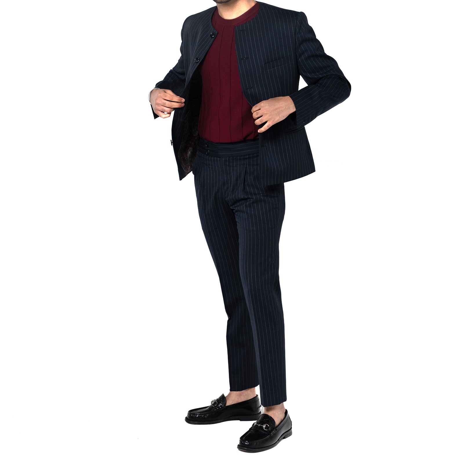 Tailored with intention and trimmed for impact, The Bond Street Crop – Navy Pinstripe delivers precision in every stitch. The round-cut collar softens the sharpness of its cropped silhouette, while five buttons and flap pockets give the jacket an edge of military-meets-mod. Crafted in a deep navy suiting fabric with a subtle shine to the pinstripe, it balances tradition with swagger. The matching trousers feature a single pleat, cuffed hems, and buttoned back flap pockets—designed for movement, not compromise. Equal parts Mayfair and Manhattan, this set doesn’t follow rules—it rewrites them.