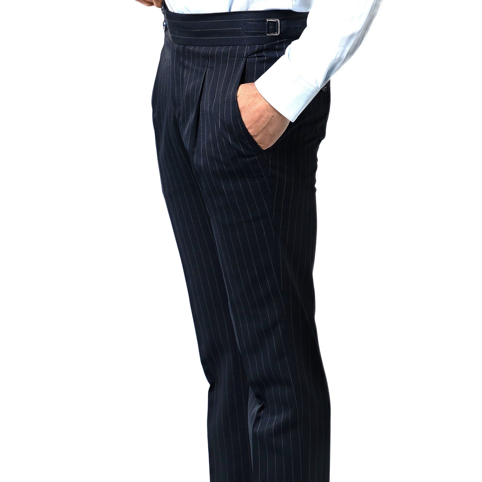 | Trousers: | Single pleat, waist adjusters, cuffed bottoms, two back flap pockets with button closures |