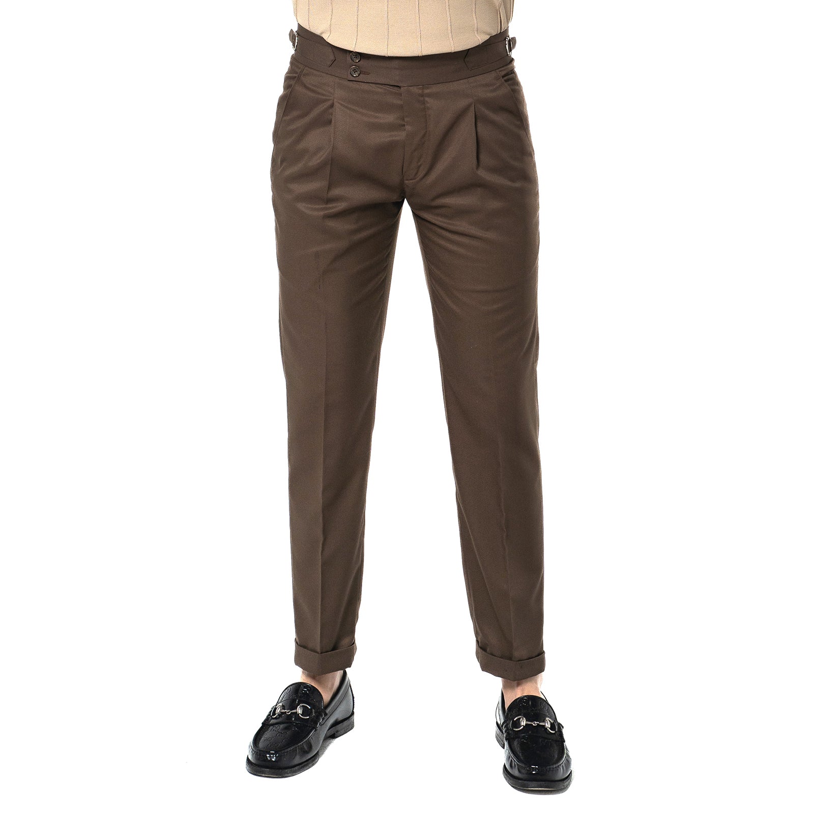 | Trousers: | Double pleats, double-button waistband with waist adjusters, two back pockets |