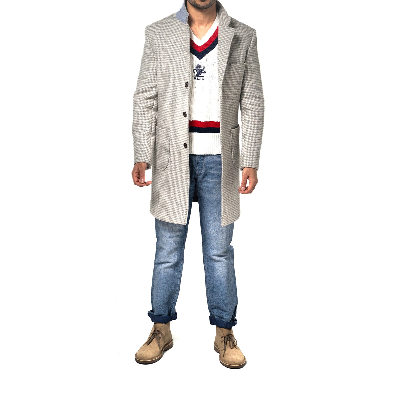 Effortlessly metropolitan, The Soho Grand is a coat that walks the line between timeless and downtown. Cut in a crisp light grey houndstooth and tailored with intention, it delivers structure without stiffness. The notch lapel and three-button front keep the silhouette sharp, while oversized patch pockets and gauntlet cuffs ground it in quiet craftsmanship. Whether layered over suiting on a brisk morning or thrown over knitwear for an evening out, this coat doesn’t shout for attention—it earns it.