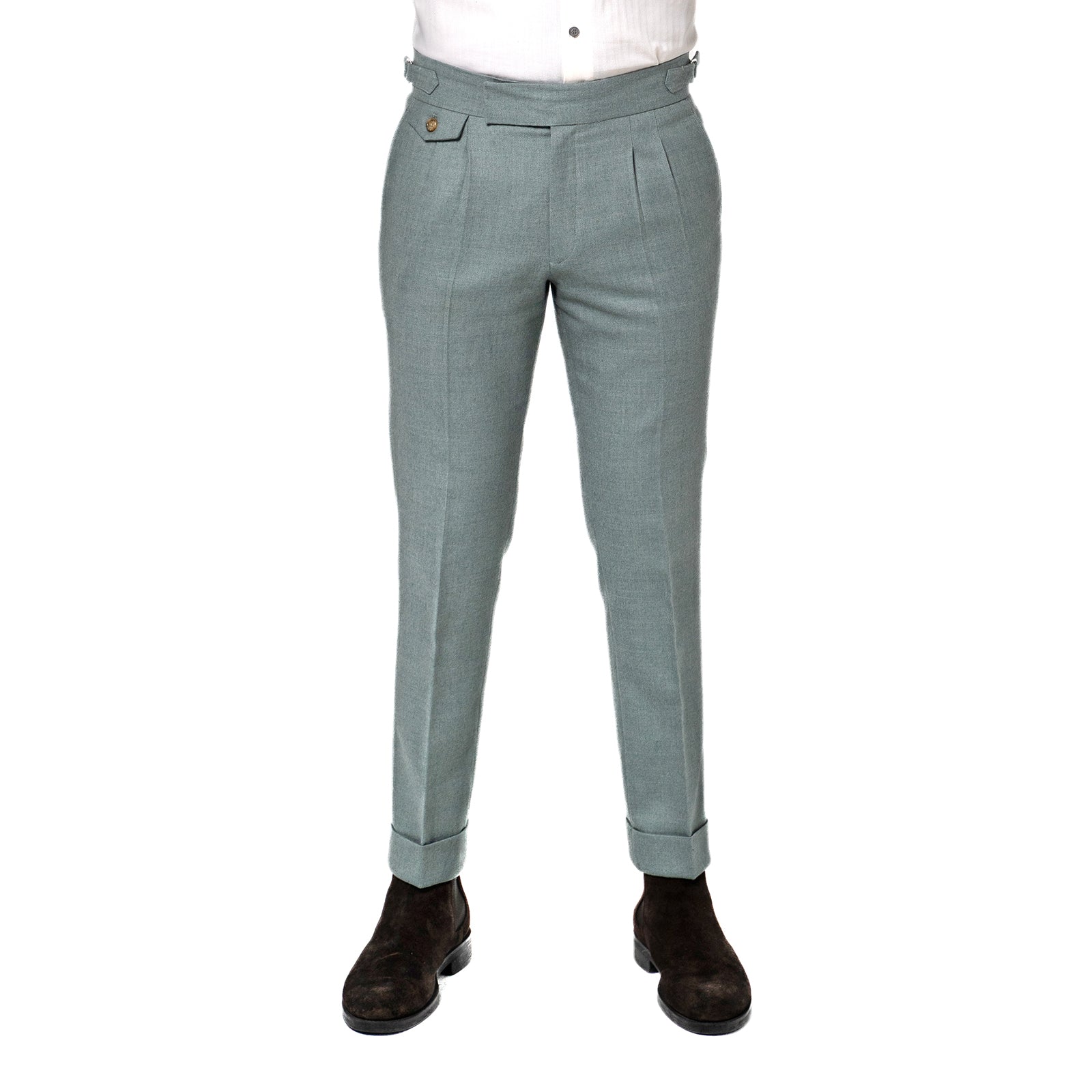 | Trousers: | Double pleats, waist adjusters, two back flap-buttoned pockets, cuffed bottoms |